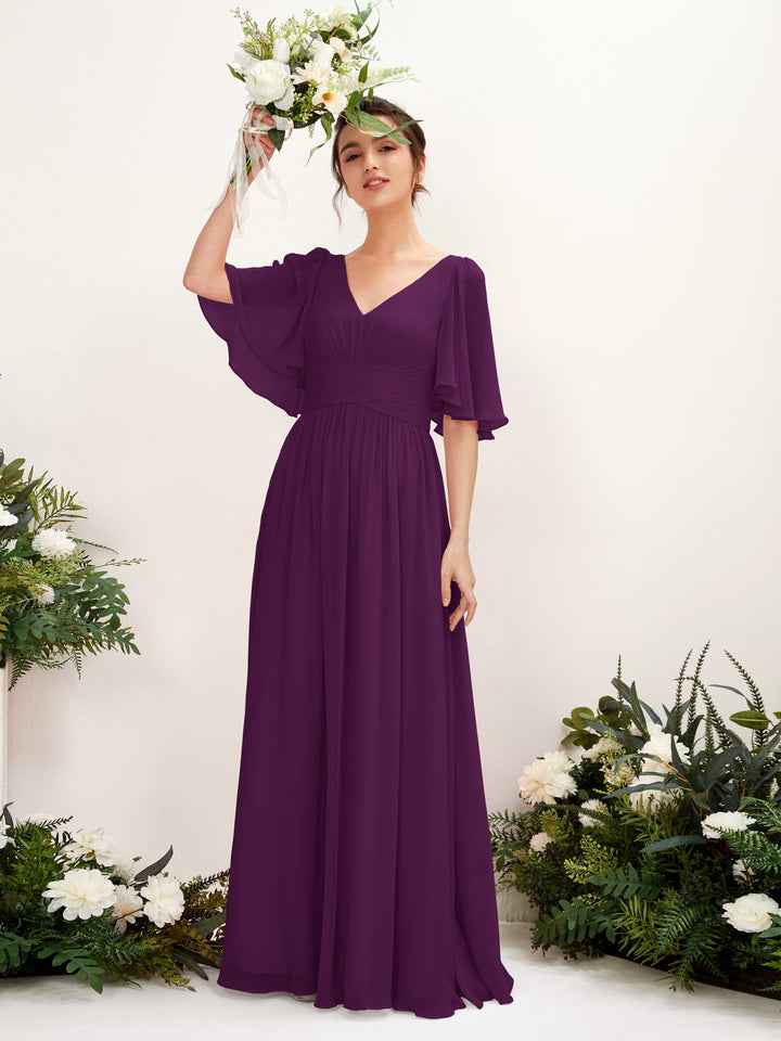 A-Linien V-Ausschnitt Kurzarm Bodenlanges Chiffonkleid
